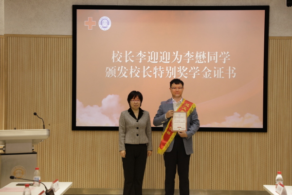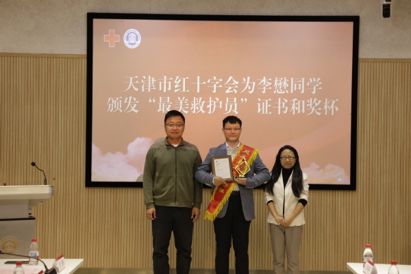 天津市红十字会为李懋颁发“最美救护员”证书和奖杯,胡志刚颁发乐玩在线(中国)唯一官方网站“优秀大学生”荣誉证书,李迎迎颁发“校长特别奖学金”荣誉证书。