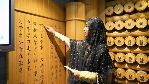 صورة التقطت في 7 أبريل للطالبة الإماراتية بشاير عمر الطنيجي في مركز تعليم اللغة والتعاون التابع لوزارة التعليم الصينية في بكين وهي تتعلم الأمثال الصينية. (شينخوا)