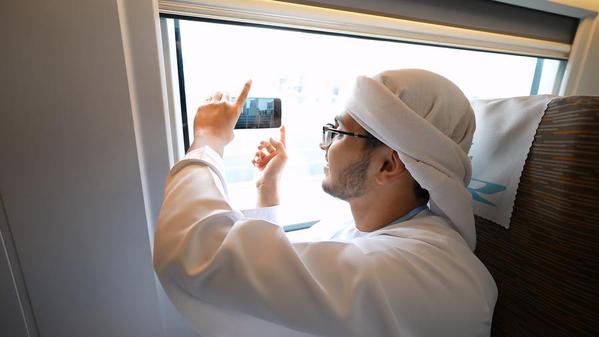صورة التقطت في 7 أبريل لطالب إماراتي، على متن قطار فائق السرعة متجه من بكين إلى محطة تيانجين، وهو يقوم بتصوير المناظر الطبيعية من نافذة القطار باستخدام هاتفه المحمول. (شينخوا)