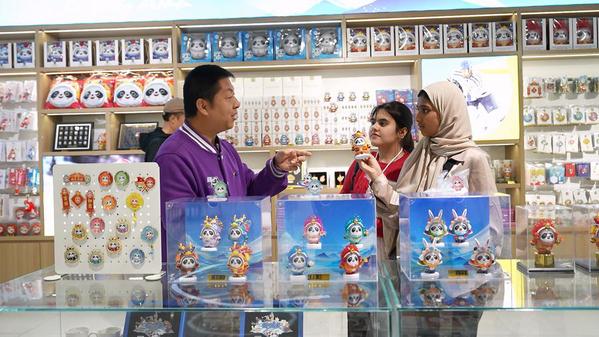 صورة التقطت في 6 أبريل للطالبة الإماراتية بشاير عمر الطنيجي وهي تقوم بشراء هدايا تذكارية من متجر الهدايا التذكارية بمتحف أولمبياد بكين. (شينخوا)