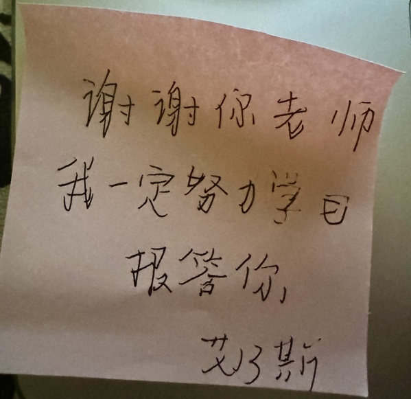 “以前觉得我还是个学生,来‘支教’就是教教课、改改作业。没想到在这里,我们既是老师,又是家长。”在完成课程教学安排之余,作为宣传报道组的成员,刘雨桐用相机记录下了许多难忘瞬间。在众多照片中,一张字迹稚嫩的便利贴格外引人注目。