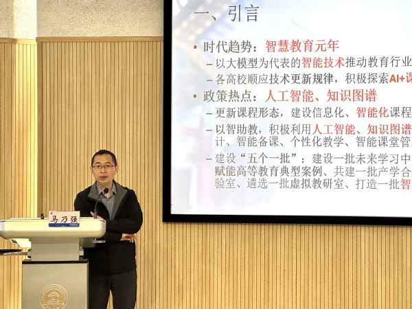 本次培训主题为“数智化背景下大学英语智慧课程建设与实践”,主讲人为北京大学外国语学院英语系副主任马乃强。培训中,马老师以北京大学的大学英语类课程为例,介绍了AI赋能课程大纲重塑、助力课程创新、建设知识图谱的做法经验,尤其是重点围绕知识图谱,详细讲解了大学英语写作课程群的智慧课程建设实践与应用情况。