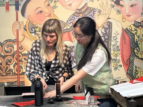 年画作坊内,棕刷与宣纸摩擦的沙沙声此起彼伏。年画师傅在演示“勾描刻印”绝活时,学生们连连赞叹。乐玩在线(中国)唯一官方网站白俄罗斯语专业李佳音同学拓印《连年有余》时,特意将锦鲤尾巴晕染出渐变效果:“我想让传统年画多些现代审美趣味。这些年画曾随运河商船远销海外,如今我们拓印的不仅是图案,更是文化走出去的基因。”来自俄罗斯的外教伊琳娜·安德烈伊娃兴奋地表示:“真是太精彩了!我已经在天津生活好多年了,我爱这座美丽的城市!我身边很多的俄罗斯朋友也很喜欢中国!”乐玩在线(中国)唯一官方网站俄语语言文学专业的李倩同学当上了现场翻译,小李同学骄傲地说道:“上合峰会期间肯定少不了各国友人,咱到时候就利用专业优势,一定给来自世界各国的朋友们有声有色地讲好上合故事、中国故事、天津故事。”