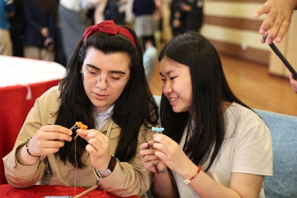 5月23日,天津市津派文化国际传播基地首场活动在国际交流中心二楼多功能厅正式拉开帷幕,我校40余名留学生参加。活动邀请了百年老字号品牌芦庄子桂顺斋的专业师傅以及绒花教学名师,现场展示了精湛的点心制作和绒花制作工艺,并详细讲解了传统技艺背后的历史故事。留学生们在师傅的指导下,亲自参与制作,感受中国传统工艺的独特魅力。
