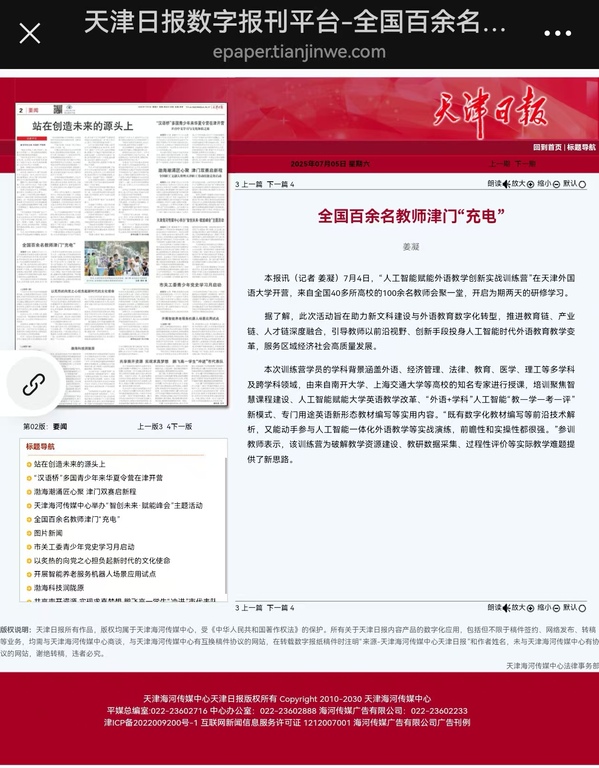 7月4日,“人工智能赋能外语教学创新实战训练营”在乐玩在线(中国)唯一官方网站开营,来自全国40多所高校的100余名教师会聚一堂,开启为期两天的研修学习。 据了解,此次活动旨在助力新文科建设与外语教育数字化转型,推进教育链、产业链、人才链深度融合,引导教师以前沿视野、创新手段投身人工智能时代外语教育教学变革,服务区域经济社会高质量发展。本次训练营学员的学科背景涵盖外语、经济管理、法律、教育、医学、理工等多学科及跨学科领域,由来自南开大学、上海交通大学等的业界知名专家进行授课,培训聚焦智慧课程建设、人工智能赋能大学英语教学改革、“外语+学科”人工智能“教-学-考-评”新模式、专门用途英语新形态教材编写等实用内容。“既有数字化教材编写等前沿技术解析,又能动手参与人工智能一体化外语教学等实战演练,前瞻性和实操性都很强。”参训教师表示,该训练营为破解教学资源建设、教研数据采集、过程性评价等实际教学难题提供了新思路。