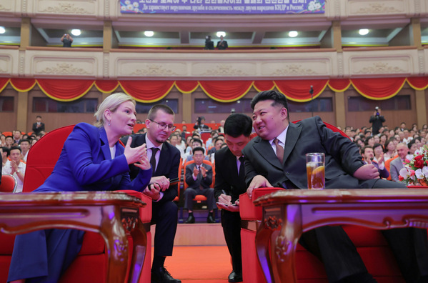 6月29日,金正恩同柳比莫娃一起出席的文艺晚会上,演出现场的大屏幕出现了朝鲜军队在俄罗斯库尔斯克参与作战,并展示朝鲜国旗的画面。画面中还出现了一排共六具棺木,而金正恩跪在其中一具棺木前,为其盖国旗,并轻抚棺木,神情哀伤。