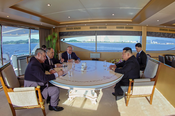 在朝鲜旅游胜地元山海边的一艘游艇上,朝鲜劳动党总书记、国务委员长金正恩会见到访的俄罗斯外长拉夫罗夫。媒体的镜头捕捉到,双方握手寒暄时拉夫罗夫笑谈两人都“还没戒烟”,两人在谈话间更是笑得合不拢嘴,会谈氛围亲切友好。