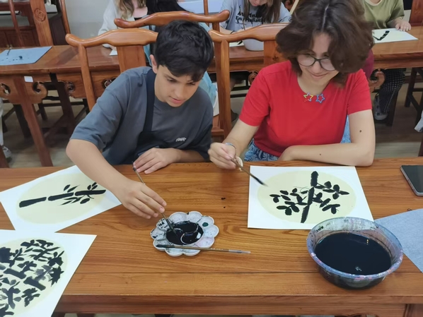 传统文化工坊由学院教师与校外名家联合授课,书法、国画、太极三大板块依次展开。同学们提笔写下端庄的“福”字,又在宣纸上点染翠竹与熊猫;晨光中,他们在海河畔缓缓起势,推手云手间体悟以柔克刚的东方哲思。墨香、竹影、拳意交汇,课堂里不时响起掌声与欢笑,友谊在不经意间升温。