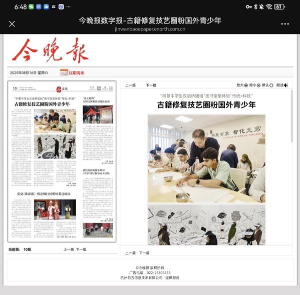 “整个活动都非常有趣味性和文化性,特别是对于古籍的修复环节,我希望能够把古籍修复的经验带回到阿曼,并且能够运用于阿曼的课堂教学。”阿曼中学带队老师法哈夫说:“中阿友谊源远流长,两个国家都有非常悠久的历史,国家历史都记载在古籍上,两国的人文交流也在进一步增强,这是令人欣喜的事。”