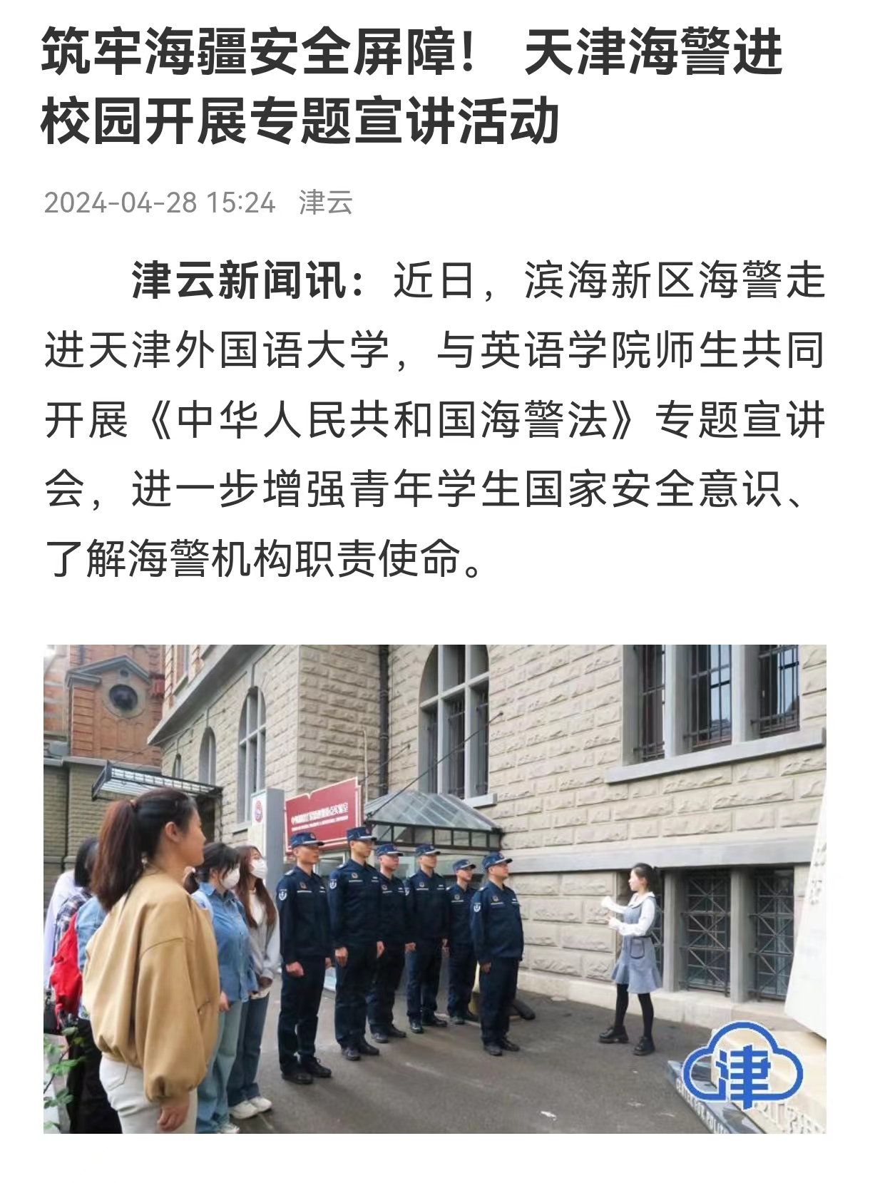 津云新闻讯:近日,滨海新区海警走进乐玩在线(中国)唯一官方网站,与英语学院师生共同开展《中华人民共和国海警法》专题宣讲会,进一步增强青年学生国家安全意识、了解海警机构职责使命。活动开始前,滨海新区海警局执法员与英语学院老师及学生代表进行座谈交流,就海警的职责使命以及当前工作对语言类人才需求进行讲述,并表示欢迎高素质人才报考中国海警,共建平安海域,同学们表示毕业后会积极报考,并赠送制作的精美海报。宣讲会上,海警执法员深入浅出地阐述了《中华人民共和国海警法》的立法目的和基本内容,向大家明确了《中华人民共和国海警法》是维护国家主权、安全和海洋权益,保护公民、法人和其他组织合法权益的重要依据,也为海警执法活动提供了明确的法律依据和指导原则。同时,结合大量生动的案例,海警执法员讲述了海上巡逻、缉私查违、救助遇险等日常执法行动过程,生动体现了海警在维护海疆安全中的关键作用。宣讲会生动有趣,点燃了青年学子为筑牢海疆安全屏障贡献青春力量的决心与热情。现场学生们纷纷表示,将积极学习海警法知识,努力提升自身素质和能力,以实际行动为维护国家安全贡献自己的力量。未来,滨海新区海警局会继续推进普法进校园活动,将《中华人民共和