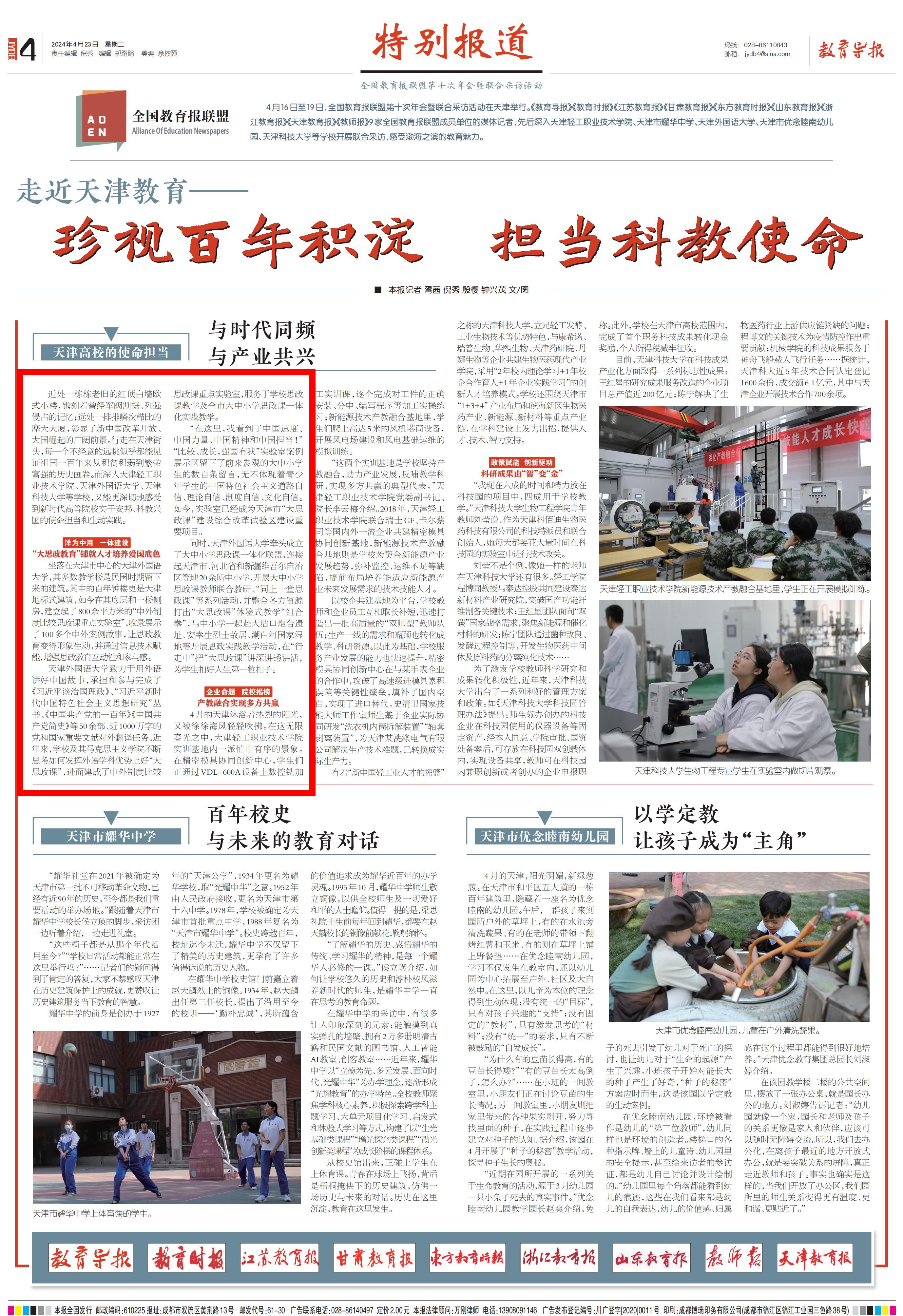 本报讯(记者马生骏丁翔 马绮微 杨争荣)4月16-19日,全国教育报刊联盟第十届年会在天津召开,来自四川、河南、江苏、甘肃、上海、山东、浙江、陕西、天津等地的9家省级教育报负责人及编辑、记者交流办报经验,探讨发展新思路。传媒变革背景下行业报怎么突围?深度融合理念下纸媒的出路在哪?专业报如何进一步服务教育高质量发展……交流中,各联盟成员介绍了各地教育报近年来的改革发展情况,分析了教育类报纸当前面临的机遇与挑战,结合本省教育报的办报定位,重点围绕纸媒与新媒体深度融合发展、采编探索、经营管理等内容展开深入交流。针对当前背景下如何推进媒体深度融合发展、如何提高采编业务提升办报水平、如何搭建媒体平台服务区域教育发展助力师生成长、如何服务区域教育、助力师生成长及社会公益活动等方面的话题和案例,联盟成员展开热烈讨论。与会人员表示,通过有益交流,彼此间取长补短,助力共同讲好教育故事。期间,联盟成员走进天津轻工职业技术学院、乐玩在线(中国)唯一官方网站、天津科技大学、天津市耀华中学、优念睦南幼儿园等开展联合采访,全方位、立体式了解天津教育。在天津轻工职业技术学院,与会人员深入学院精密模具与智能制造产教融合基地、新能源