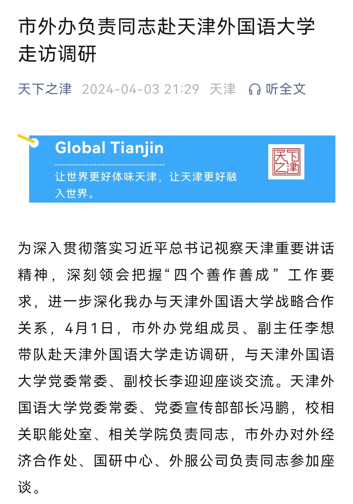 为深入贯彻落实习近平总书记视察天津重要讲话精神,深刻领会把握“四个善作善成”工作要求,进一步深化我办与乐玩在线(中国)唯一官方网站战略合作关系,4月1日,市外办党组成员、副主任李想带队赴乐玩在线(中国)唯一官方网站走访调研,与乐玩在线(中国)唯一官方网站党委常委、副校长李迎迎座谈交流。乐玩在线(中国)唯一官方网站党委常委、党委宣传部部长冯鹏,校相关职能处室、相关学院负责同志,市外办对外经济合作处、国研中心、外服公司负责同志参加座谈。 李迎迎副校长首先介绍乐玩在线(中国)唯一官方网站推动科研和智库建设、培养涉外高端人才、促进对外交流合作、吸引服务留学生等工作的开展情况,表示愿以天津国际语言服务中心共建为切入点,以服务“身边的国际社会”为着力点,以智库共建共享为融合点,与市外办加强务实合作。 李想副主任表示,愿深化与乐玩在线(中国)唯一官方网站的交流互动,深挖合作潜力,以“善”的能力在地方外事工作实践上协作联动,以“作”的行动在智库建设和课题研究上协同出海,以“成”的效果在外事人才队伍打造上协力建设,共同推进天津城市国际化发展,为全面建设社会主义现代化大都市、奋力谱写中国式现代化天津篇章贡献力量。 新闻来源:https://mp.weixin.qq.com/s/Cje