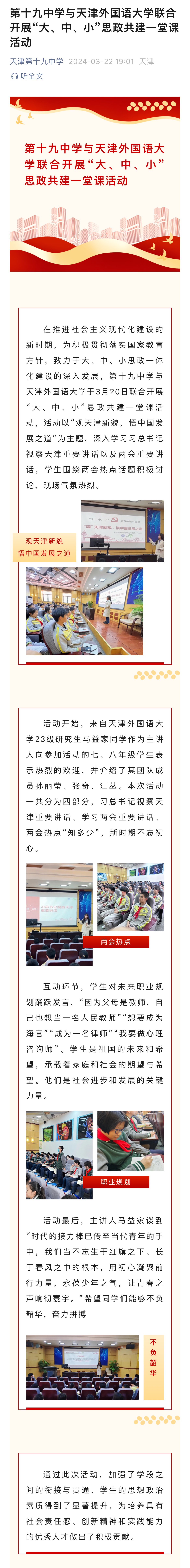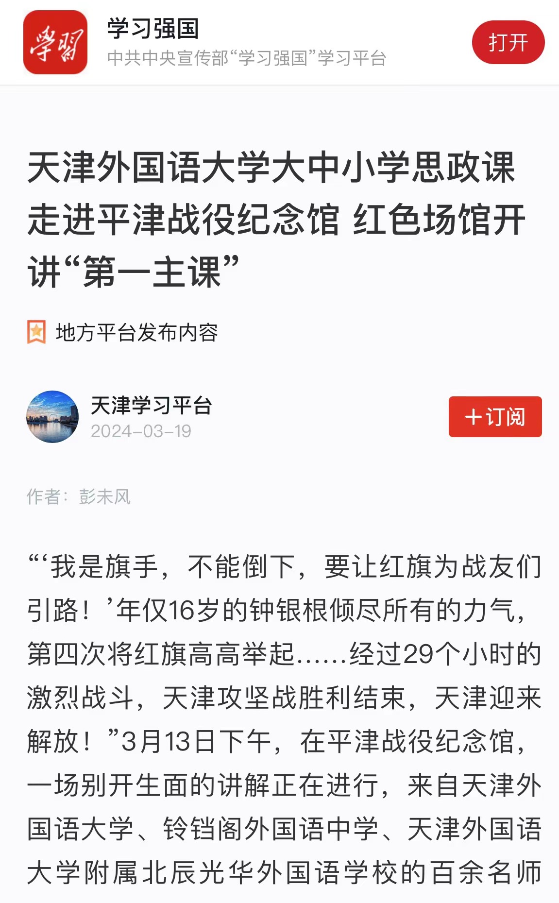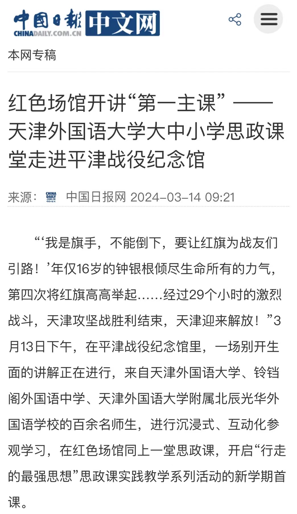 昨日的平津战役纪念馆里,一场别开生面的讲解正在进行。来自乐玩在线(中国)唯一官方网站、铃铛阁外国语中学、乐玩在线(中国)唯一官方网站附属北辰光华外国语学校的百余名师生,进行沉浸式、互动化参观学习,在红色场馆同上一堂思政课,开启“行走的最强思想”思政课实践教学系列活动的新学期首课。新闻链接:http://digitalnewspaper.tjyun.com/newspaper/v6.5/jwbDetail.html?resultId=731879_7878a2465b335ce857d9ecea690dde533d1637c7745c210c145210d61b6b579f&layout=2&date=20240314