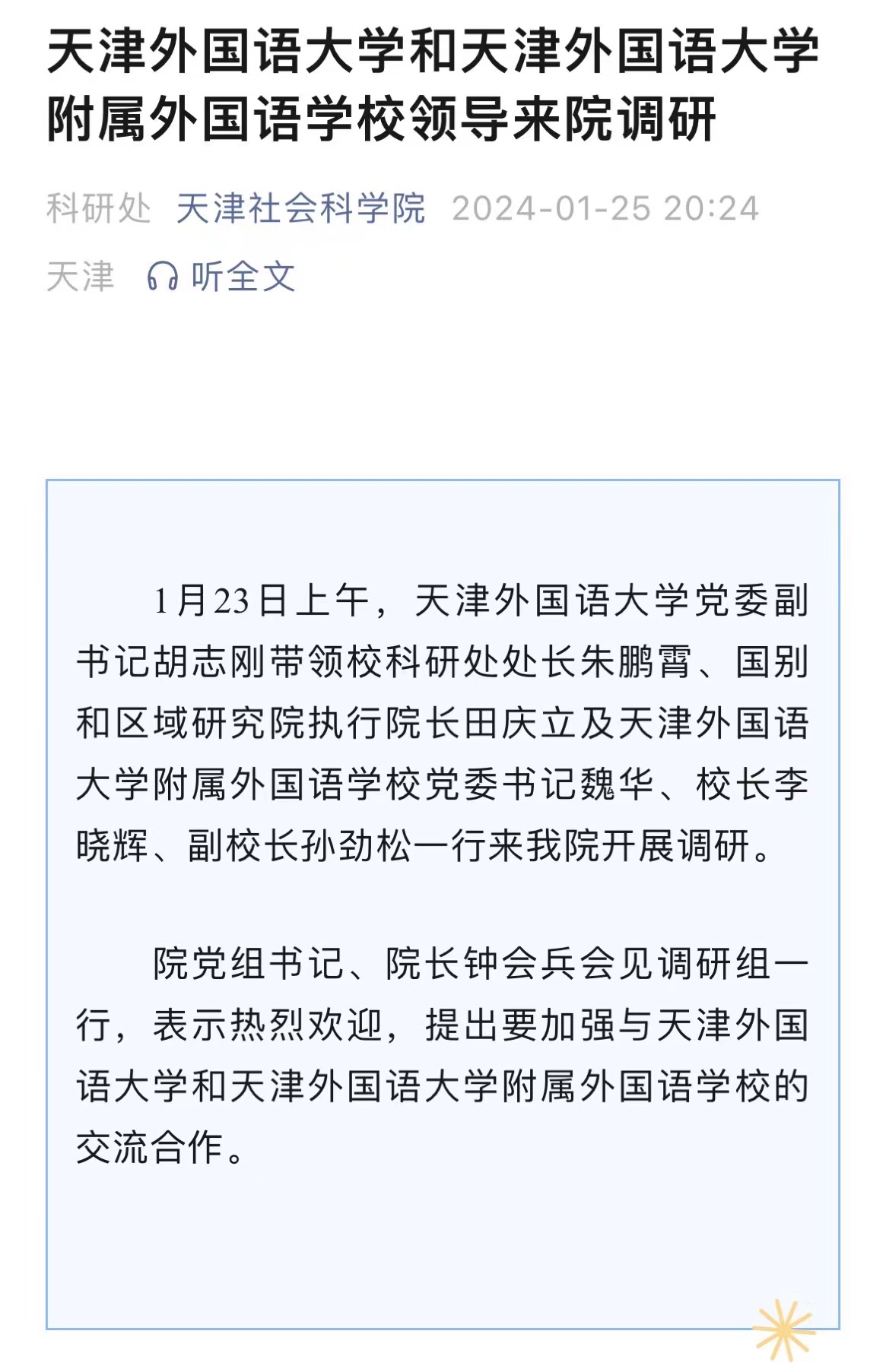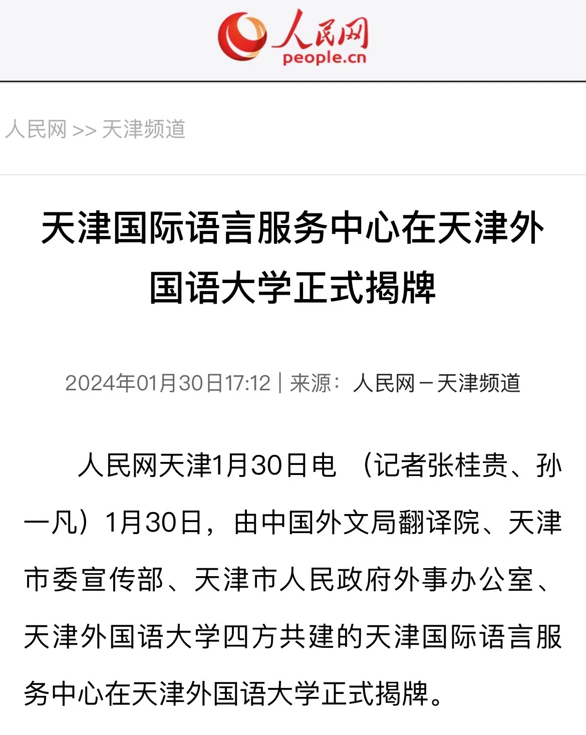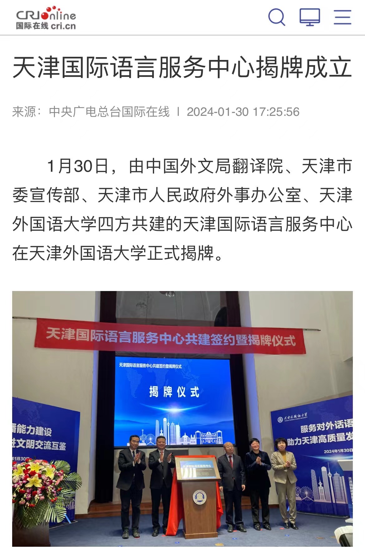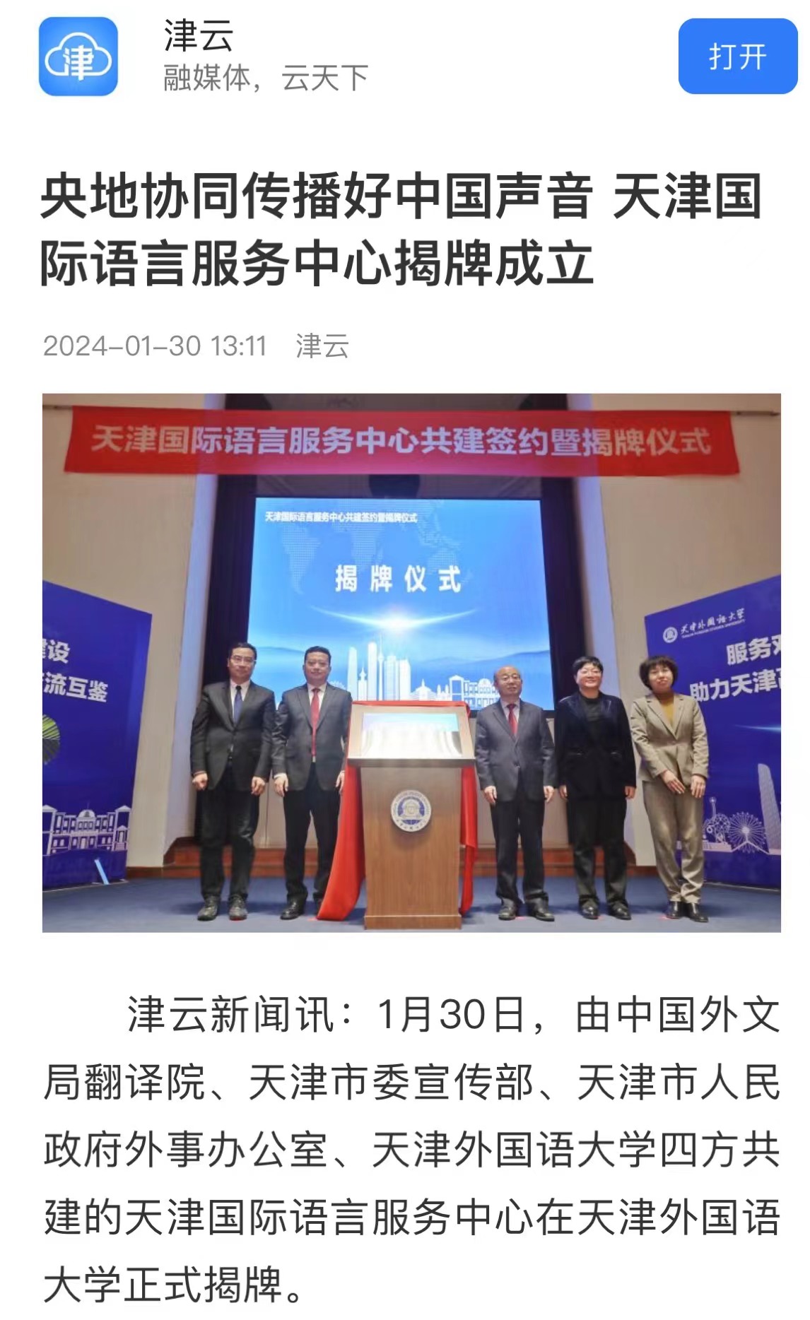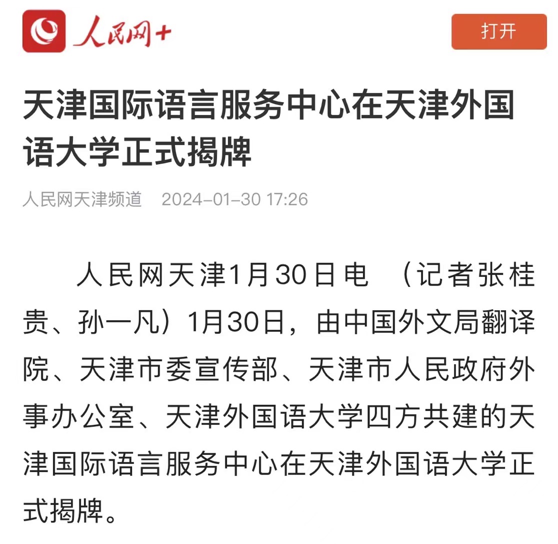 1月30日,由中国外文局翻译院、天津市委宣传部、天津市人民政府外事办公室、乐玩在线(中国)唯一官方网站四方共建的天津国际语言服务中心在乐玩在线(中国)唯一官方网站正式揭牌。2023年9月,中国外文出版发行事业局(以下简称“中国外文局”)与天津市委宣传部签署了国际传播战略合作框架协议,就加强新时代中国特色社会主义思想国际传播合作、加强对外出版合作、加强媒体国际传播合作、加强外宣研究和翻译合作、加强文化产业相关合作、合力打造文化外宣品牌、合作培育外宣人才队伍等方面开展合作。此次天津国际语言服务中心揭牌成立,是落实合作协议精神的重要成果,旨在打造集服务政府决策、理论创新、实践育人于一体的新型语言服务机构,搭建加强国际传播能力建设、促进文明交流互鉴、助力天津社会主义现代化大都市建设及高水平对外开放的重要平台。乐玩在线(中国)唯一官方网站党委书记周红蕾表示,乐玩在线(中国)唯一官方网站(以下简称“天津外大”)充分发挥外语特色和语言优势,积极培养高水平外语人才,迄今已招收博士研究生近百人,32人已获得博士学位。同时,天津外大大力开展党和国家重要文献对外翻译,已完成《中国共产党一百年》(第一、二卷)等53部文献外译任务,在海内外引发热烈反响。天津国际语言