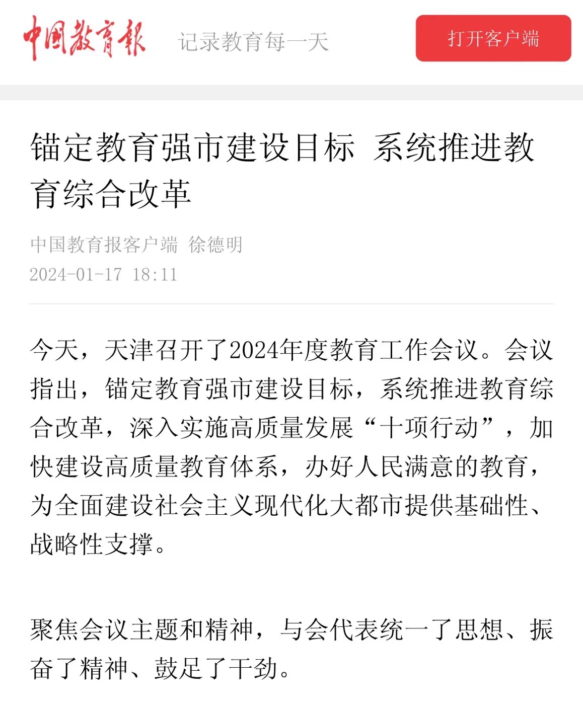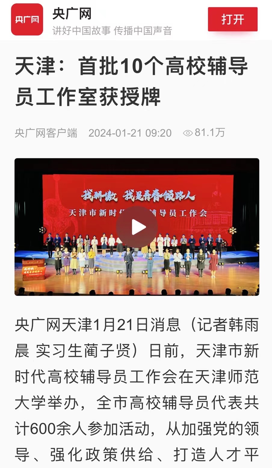 央广网天津1月21日消息(记者韩雨晨 实习生蔺子贤)日前,天津市新时代高校辅导员工作会在天津师范大学举办,全市高校辅导员代表共计600余人参加活动,从加强党的领导、强化政策供给、打造人才平台、改革评价机制、完善辅导员职业发展体系和岗位晋升制度、着力打造高素质专业化职业化辅导员队伍等方面介绍经验做法。辅导员是开展大学生思想政治教育的骨干力量,是学生日常思想政治教育和管理工作的组织者、实施者和指导者。在“我骄傲,我是青春领路人”分享环节,全国辅导员年度人物、全国高校网络教育名师、天津市十佳辅导员、天津市优秀辅导员、天津市高校辅导员工作室主持人代表,围绕“陪伴是最长情的告白”“守护是最温暖的承诺”“领航是最执着的追求”三个单元进行分享讲述。此外,为推进高校辅导员队伍专业化、职业化建设,探索适应天津市高校学生思想政治教育规律的辅导员工作室建设机制、方法。天津市围绕大学生思想理论教育和价值引领、心理健康教育、辅导员素质能力提升等建设方向,培育建设一批精品辅导员工作室,并遴选出“亦心”工作室等10个首批天津市普通高校辅导员工作室。会上,全体辅导员进行庄严宣誓,并为首批天津市普通高校辅导员工作室授牌