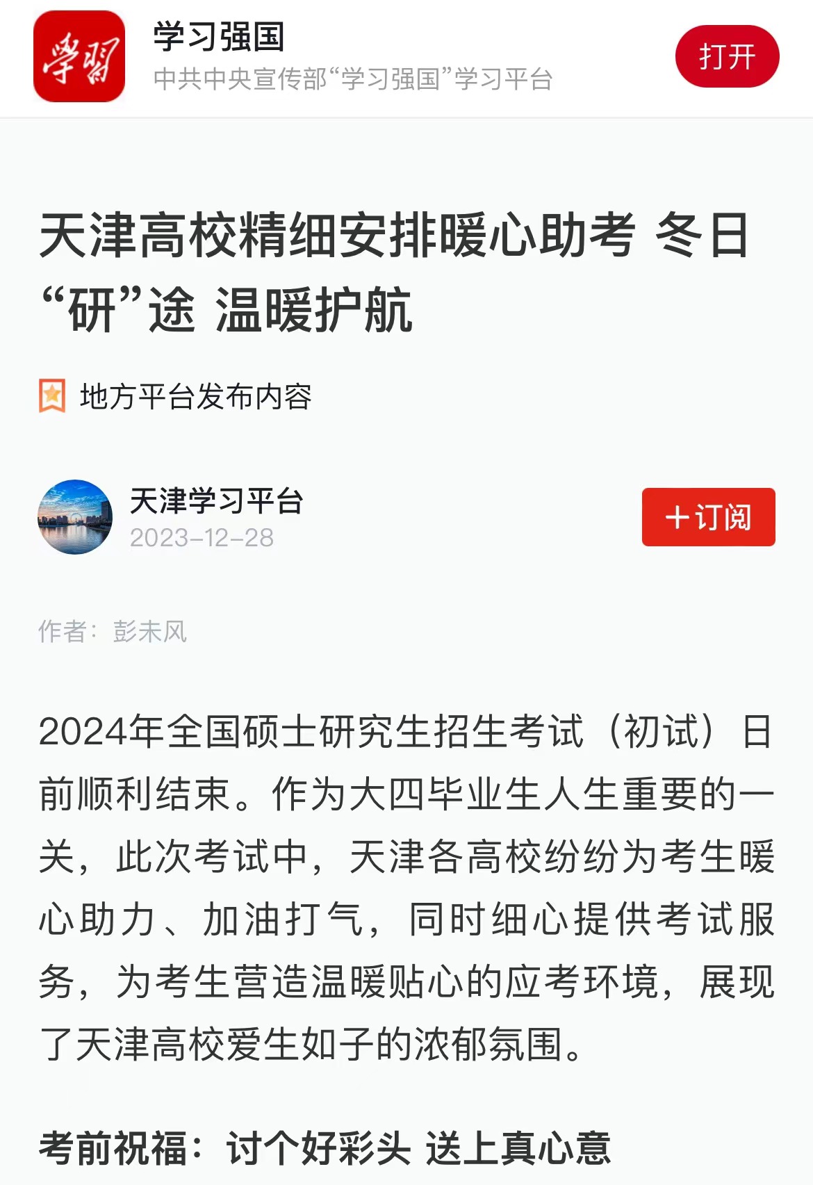 2024年全国硕士研究生招生考试(初试)将于明日开考,作为大四毕业生人生重要的一关,天津各高校纷纷为学生暖心助力,加油打气,展现了天津高校爱生如子的浓郁氛围。 讨个好彩头,送橙子表心意成风潮 记者发现,给考生送橙子是许多高校向学生表达心意的举措。天津工业大学纺织科学与工程学院为坚定学生的备考信心,缓解考试压力,传递温暖力量,给考研学子送水果,以“心想事‘橙’,一战‘橙’硕”之意预祝考研学子们成功“上岸”。天津理工大学后勤管理处联合各服务企业为全校3000多名考研学生免费赠送水果,每人一个橙子一根香蕉,寓意“心想事‘橙’、为你‘蕉’傲”。天津财经大学食堂考研日当天有免费橙子发放,祝福考生们心想事“橙”。 天津科技大学化工与材料学院的第一届“暖冬‘果’然有你”水果文化节背后则有一个暖心故事。12月中旬,学院了解到,一名经济困难学生家里以种植橙子为唯一收入来源,但今年面临橙子大面积滞销的困境,造成生活难上加难。学院领导第一时间决定面向该生家庭进行采购,将助困与助农紧密结合,组织策划第一届水果文化节。化工学院为每一位师生准备一份水果礼包,并精心制作了“苹”安上岸、一战“橙”硕、马到“橙”功、“