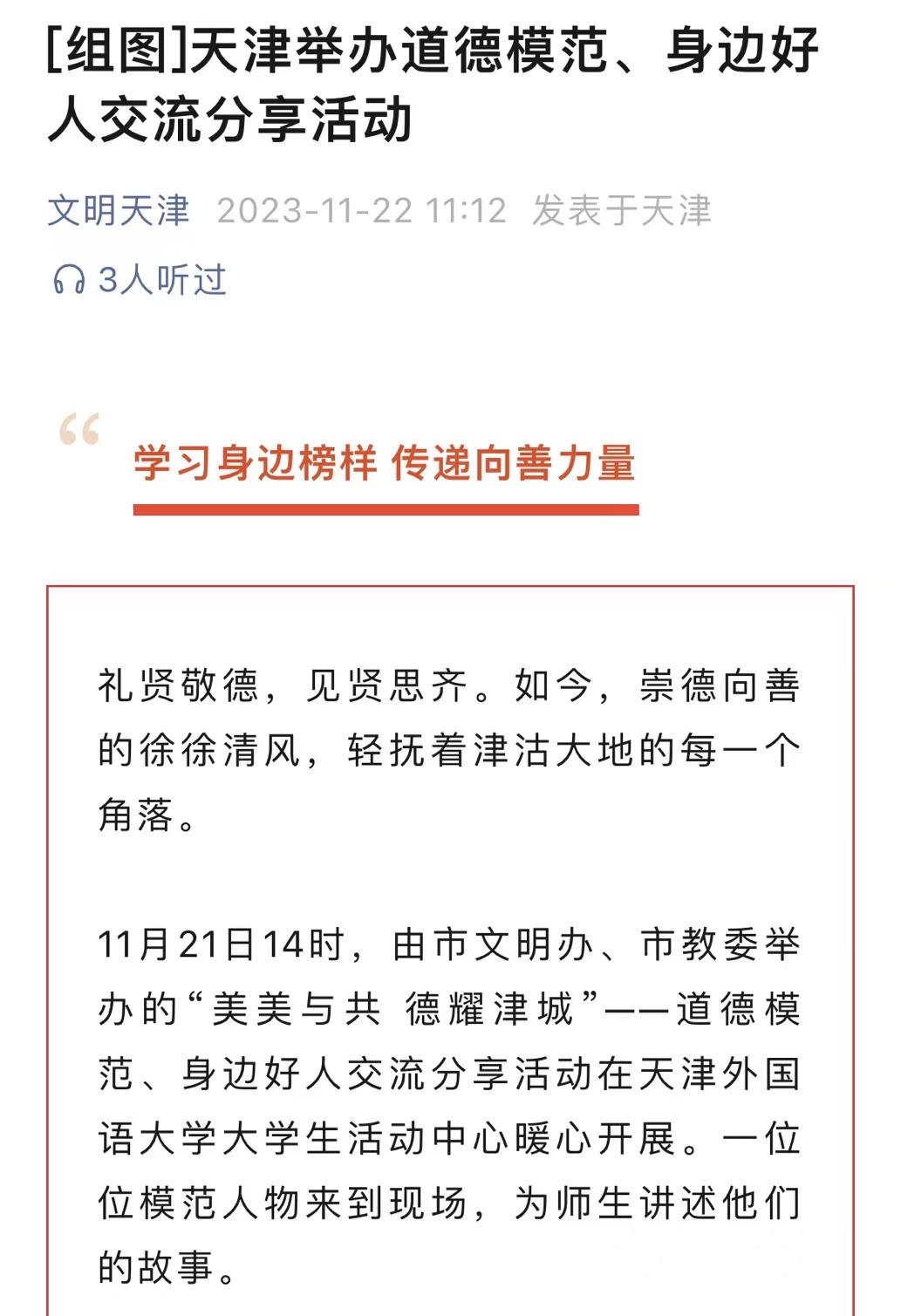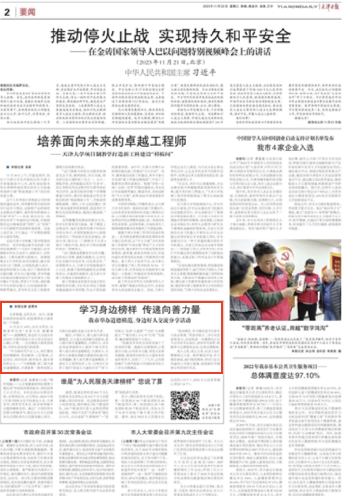 礼贤敬德,见贤思齐。如今,崇德向善的徐徐清风,轻抚着津沽大地的每一个角落。11月21日14时,由市文明办、市教委举办的“美美与共 德耀津城”——道德模范、身边好人交流分享活动在乐玩在线(中国)唯一官方网站大学生活动中心暖心开展。一位位模范人物来到现场,为师生讲述他们的故事。“作为新时代产业工人,我们要发扬劳模精神、劳动精神、工匠精神,立足岗位,刻苦钻研,做学技术、强本领的带头人……”天津楷模、第三届天津市道德模范、天津港第一港埠有限公司拖头队副队长成卫东率先开讲。随后,中国好人、第七届天津市道德模范、五大道义务讲解员张振东,第八届天津市道德模范、天津好人、市司法局法律援助中心退休干部马芳菲,第八届天津市道德模范、天津好人、天津市人体器官捐献志愿服务队副大队长邢蕴静,第八届天津市道德模范、天津好人王智萍依次上台,与师生们分享了他们“讲述五大道的历史”“用‘小快板儿’宣讲‘大道理’”“当好‘生命摆渡人’”“做失明儿子心中‘灯塔’”的故事,触动着现场每个人的心。“张振东爷爷的分享给我留下了深刻的印象。他践行志愿精神,以爱国为主线,以传承为主题,用名人故事来链接,把值得回味的五大道故事讲述给更多人,坚持了二