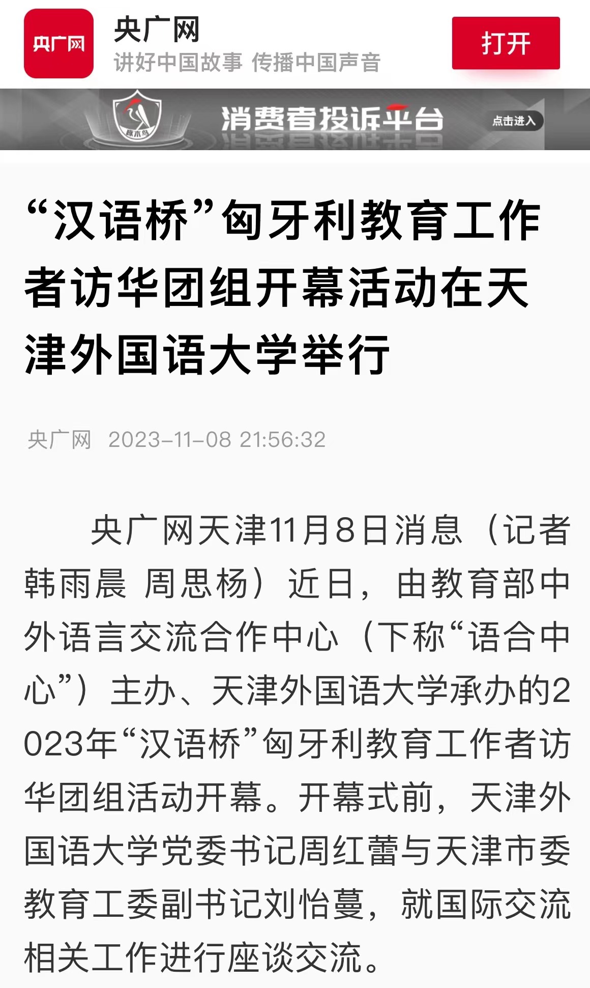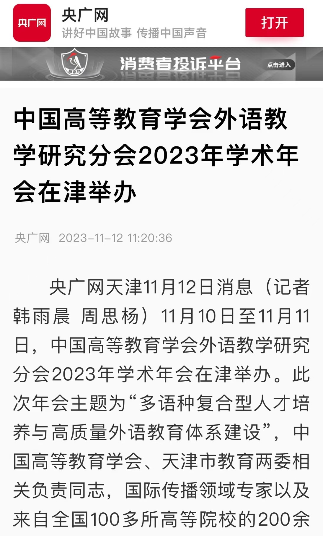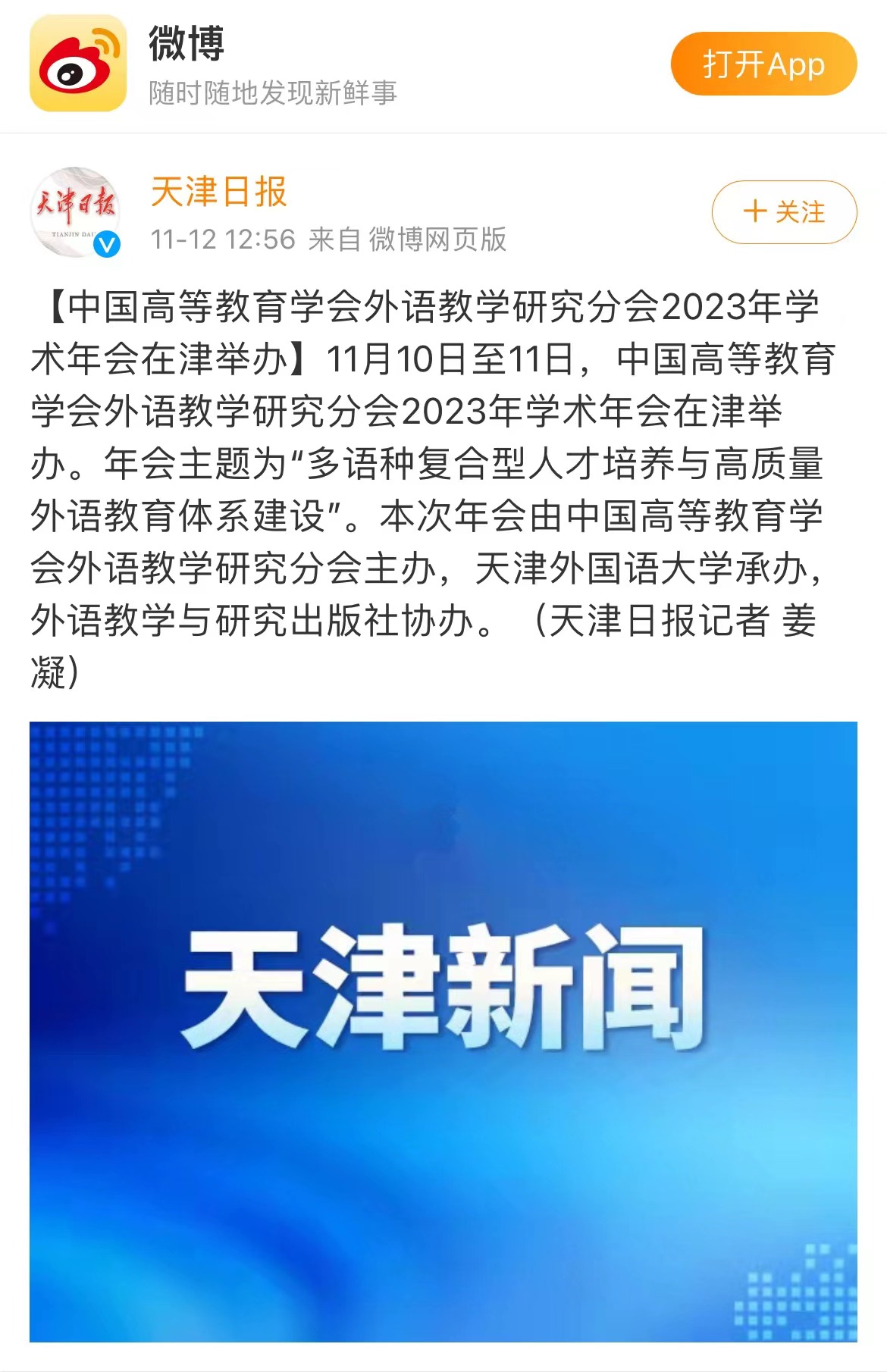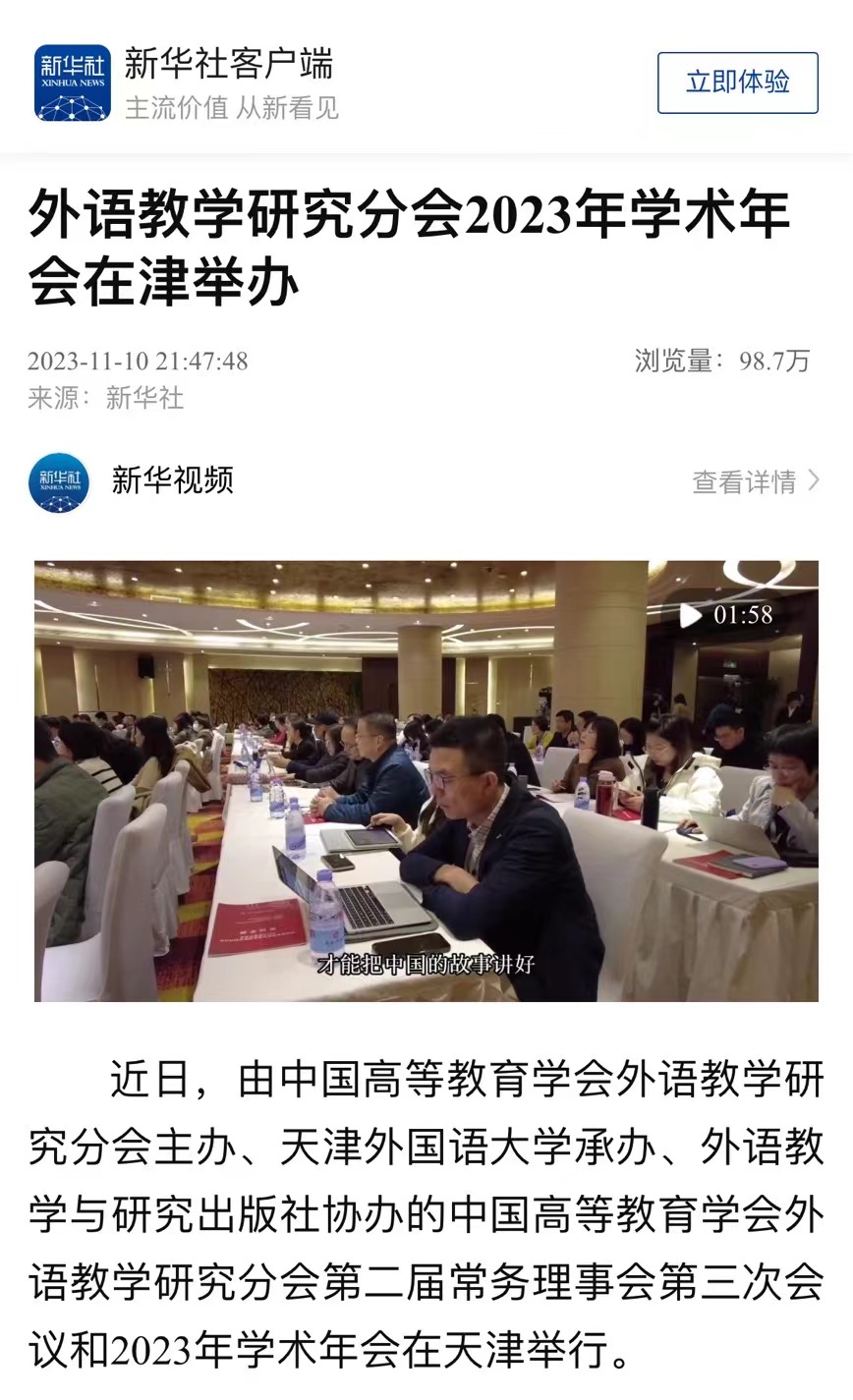 央广网天津11月12日消息(记者韩雨晨 周思杨)11月10日至11月11日,中国高等教育学会外语教学研究分会2023年学术年会在津举办。此次年会主题为“多语种复合型人才培养与高质量外语教育体系建设”,中国高等教育学会、天津市教育两委相关负责同志,国际传播领域专家以及来自全国100多所高等院校的200余名代表齐聚一堂,以党的二十大精神为指引,共探外语复合型人才培养新路径,共绘外语教育高质量发展新华章。中国高等教育学会副会长李家俊,中国高等教育学会外语教学研究分会理事长、北京外国语大学党委书记王定华,天津市委教育工委副书记刘怡蔓,乐玩在线(中国)唯一官方网站党委书记周红蕾出席开幕式并分别致辞。乐玩在线(中国)唯一官方网站党委副书记、校长陈法春主持开幕式。李家俊代表中国高等教育学会对学术年会的召开表示热烈祝贺,对外语教学研究分会为学会发展作出的重要贡献表示诚挚感谢。他衷心希望外语教学研究分会继续踔厉奋发、勇毅前行,并对分会下一阶段发展提出要求:一是要坚持党建引领,增强组织凝聚力;二是要坚持学术立会,发挥学术引领力;三是要坚持大局意识,提高社会服务力;四是要坚持开放交流,扩大国际影响力。王定华在视频致辞中对与会专家和代表