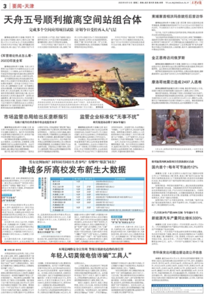 本报讯津城高校近日陆续迎来2023级本科新生,不少人好奇“这届大一新生男女比例如何”“同年同月同日生者多吗”“有哪些‘爆款’同名”……多所高校近日发布新生大数据,多角度剖析2023级本科生这些“指标”。男女比例既有“平分秋色”也有“各领风骚”南开大学2023级新生男女比例为1.08:1,其中,临床医学(5+3一体化)专业男女比为1:1,当属“完美平衡”。基本“平分秋色”的还有:天津职业技术师范大学2023级新生的男女比例是1.29:1,天津体育学院2023级本科新生的男女比例约为1.26:1。在天津大学、河北工业大学、中国民航大学、天津城建大学、天津理工大学中,男生人数占优势。从2023级本科新生男女比例来看,天津大学约为2.37:1,河北工业大学接近2:1,中国民航大学约为2.5:1,天津城建大学约为2.02:1,天津理工大学约为1.7:1。在天津中医药大学、乐玩在线(中国)唯一官方网站、天津财经大学中,女生比例高于男生。这些高校的2023级本科新生男女比例是:天津中医药大学约为1:2.17,乐玩在线(中国)唯一官方网站为1:3.35,天津财经大学接近1:2。“爆款”同名“刘畅”“李想”等同学能在大学碰到“另一
