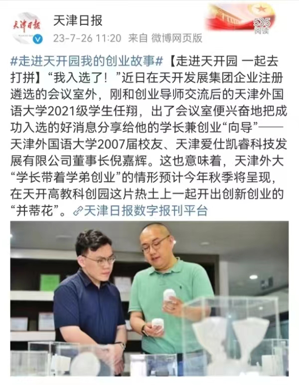 “我入选了!”近日在天开发展集团企业注册遴选的会议室外,刚和创业导师交流后的乐玩在线(中国)唯一官方网站2021级学生任翔,出了会议室便兴奋地把成功入选的好消息分享给他的学长兼创业“向导”──乐玩在线(中国)唯一官方网站2007届校友、天津爱仕凯睿科技发展有限公司董事长倪嘉辉。这也意味着,天津外大“学长带着学弟创业”的情形预计今年秋季将呈现,在天开高教科创园这片热土上一起开出创新创业的“并蒂花”。 “申请入驻天开园吧,那里可以为创新创业提供更大的平台和空间,咱们一起打拼!”任翔告诉记者,正是倪嘉辉的这句鼓励,使他鼓起勇气向天开园提交了入驻申请。“有了学长兼校友企业家的指点,我的创业梦得以生根发芽。”任翔说,他俩相识于乐玩在线(中国)唯一官方网站里的一次访谈,当时作为天开园首批入驻企业家之一,倪嘉辉给了任翔许多创业的建议。也正由此,任翔决定将其所创的津宛堂中医药信息科技有限公司注册在天开园。“我生于名医张仲景的故乡南阳,从小便在耳濡目染中接受中医药的熏陶。学校为我们聘请创业指导教师、提供机会结识创业成功的学长,指导我在天开园这样的舞台上施展拳脚。”任翔说。倪嘉辉则表示,共同创业的师兄弟之间可以互帮互助,学校可以给予大家科研和人