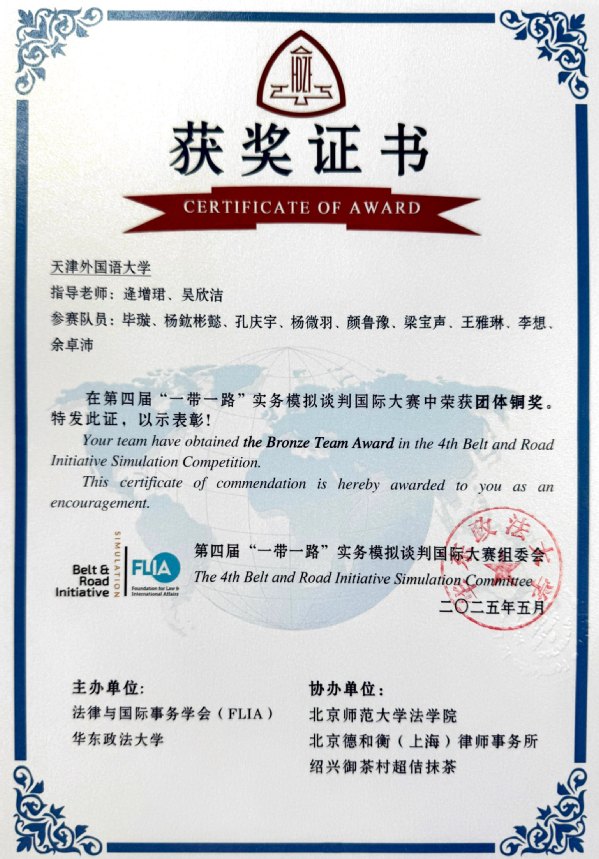 近日,由法律与国际事务学会(FLIA)、华东政法大学承办的第四届“一带一路”实务模拟谈判国际大赛在华东政法大学(松江校区)成功举办,包括上海交通大学、同济大学、四川大学等来自全国各地的68支高校代表队参加了此次比赛。经过激烈角逐,天外代表队荣获全国铜奖。本次比赛以“一带一路”倡议内的项目为假设性案例,要求参赛学生具备信息检索、公共演讲、法律文书写作、跨文化谈判决策等重点技能,是对参赛学生语言能力、创新能力、自主决策、临场反应、逻辑思维、演讲表现等全方位考验。天外代表队由国际关系学院副院长黄影牵头,专业课教师逄增珺指导,辅导员老师吴欣洁带队,本科生毕璇、杨鈜彬懿、孔庆宇、杨微羽、颜鲁豫、梁宝声、王雅琳、李想、余卓沛组成了一支跨专业复合型团队。凭借扎实的英语口语能力、卓越的谈判技巧、灵活的应变能力和默契的团队协作,回应各代表方关切,对各个议题提出合理的解决方案,首次参赛便荣获佳绩。自今年2月团队组建以来,参赛队员们始终将团队协作、锐意进取、追求卓越的备赛理念贯彻到底。赛题案例发布后,全队有条不紊地开展法律文献研究、谈判技能培训,坚持每周召开会议,进行案例研讨与进度汇报,共同撰写诉状,并不断